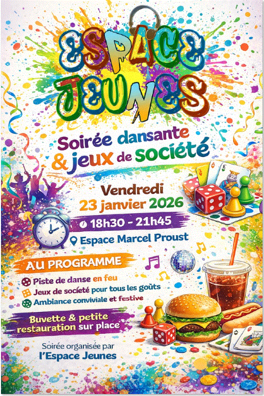 SOIRÉE DANSANTE ET JEUX DE SOCIÉTÉ Actualités, Centre de loisirs, Espace Jeunes13 janvier 2026Commentaires fermés sur SOIRÉE DANSANTE ET JEUX DE SOCIÉTÉ Chers parents, L’espace jeunes propose une soirée dansante et jeux de société le vendredi 23 janvier 2026 Ambiance conviviale et festive